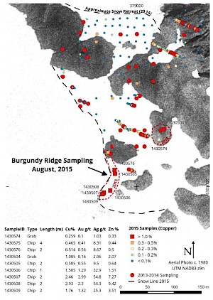 The additional prospecting and sampling carried out at Burgundy Ridge corroborates the high grade nature of the copper-gold-silver mineralization encountered in previous work on the property and adds credence to management's belief that the mineralization extends beneath the snowfields encircling the approximate 400 metres of mineralized surface exposure. In addition, the sampling enlarged the area underlain by high grade mineralization outlined by the sampling carried out during the summers of 2013 and 2014 at Burgundy Ridge.