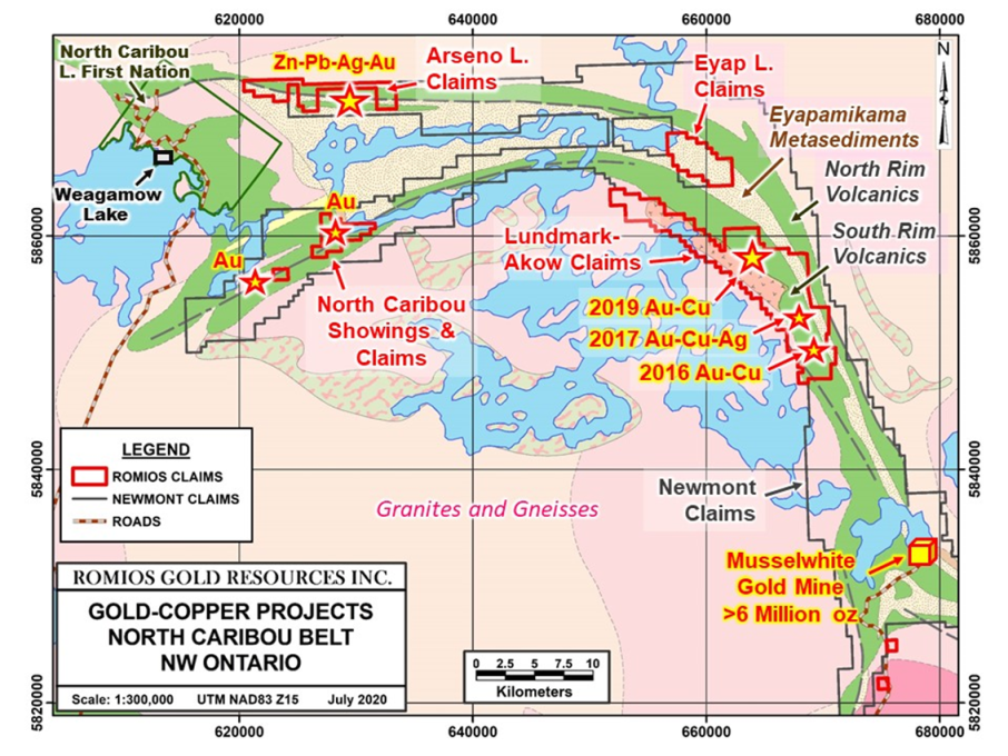 Diamond drilling of the outstanding gold and VMS targets on Romios’ Lundmark-Akow Lake project, 53 km to the SE of the North Caribou River claims, is now scheduled for early August (see Romios’ news releases December 5, 2019 and March 4, 2021). An initial mapping and sampling program on Romios’ Arseno Lake banded iron formation hosted base metal-gold-silver prospect is also planned for August (see Romios’ news release April 27, 2020).