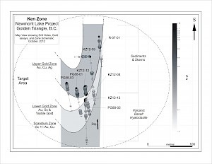 During July and August of 2012, Romios drilled 6 holes at the Ken Zone, which totalled 804.5 metres (2,634 feet) in length. This drilling identified three distinct zones of mineralization: 1) an Upper Gold Zone characterized by sulphides and magnetite-rich skarns containing gold (Au), copper (Cu), silver (Ag) and scandium (Sc); 2) a Lower Gold Zone featuring a network of thin veins hosting visible gold; and 3) a Scandium Zone which appears to correlate with an underlying volcanic basalt. Collectively, these three zones are believed to be a volcanic massive sulphide (VMS) mineralizing system. Historic drilling in the area was limited to shallow observations; Pezgold Resources first tested the Ken Zone in 1988, and in 2007 Romios drilled a single hole R-07-01 (Press Release dated December 18, 2007) which, subsequently was resampled over a greater core length during the summer of 2012.