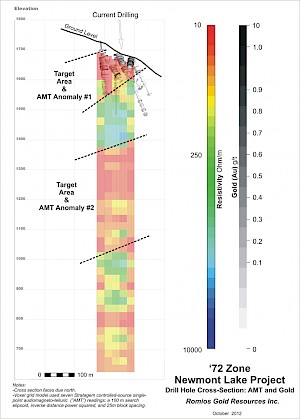 Seven single-point audiomagnetotellurics geophysical readings ("AMT") were also conducted at the '72 Zone in July 2012. The AMT readings registered high conductivities from surface down to 190 metres, coincident with the zone of sulphide mineralization tested by the six holes outlined above. Additionally, the AMT readings displayed a second area of high conductivities from 300-500m depth, however, this area has yet to be drill-tested.