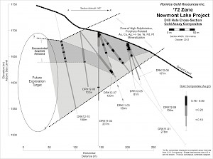 Drill core from the remaining eight of 14 holes drilled at the Ken and Northwest zones on the Newmont Lake Project have been submitted for assay. Results will be released when received and reviewed by the Company. Plan-view maps, cross sections, and a complete list of drill assays and composites from the '72 Zone can be found on Romios' website at http://www.romios.com/s/Newmont.asp.