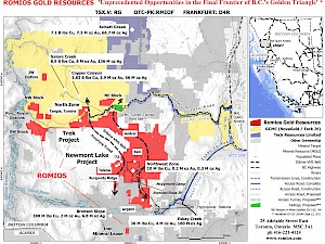 The mineral tenures expand Romios' land position southward along the projected metallogenic corridor of the Newmont Lake Project. Field evidence acquired during Romios' 2012 summer exploration campaign (reviewed in Press Releases dated August 9 and July 10, 2012) confirms that the mineralized zones on the Newmont Lake Project coincides with the BC Ministry of Mines' ("BCGS") interpretation of a volcanic massive sulphide ("VMS") belt of mineralization which extends over a distance of at least 20 kilometres (see Press Release dated March 3, 2011, and BCGS Open File 2011-02).
