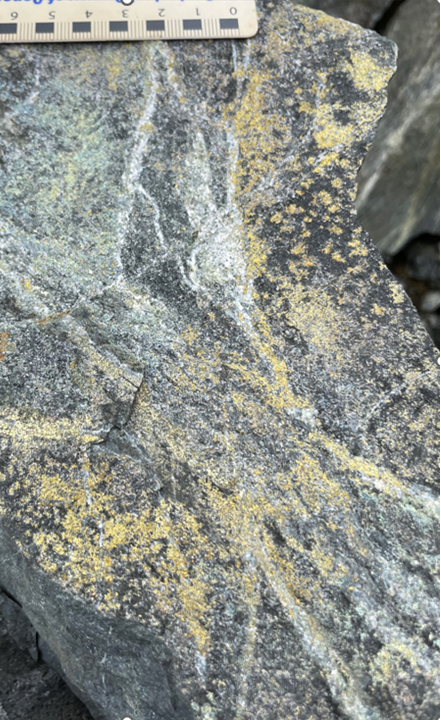 PHOTO 1: Chalcopyrite (copper sulphide) covered fractures on boulder along Trek South IP survey line.