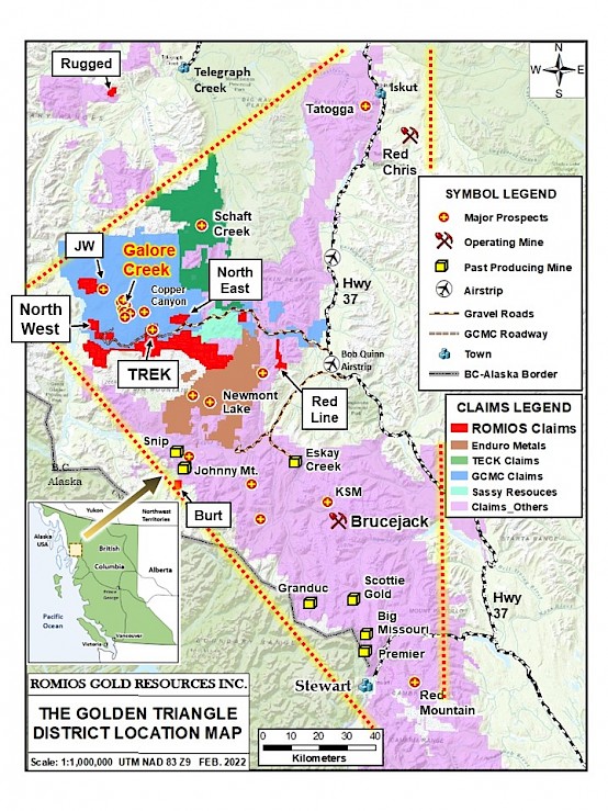 Toronto, Ontario – September 29th, 2022: Romios Gold Resources Inc. (“Romios Gold” or the “Company”) (TSX.V-RG; OTCQB: RMIOF; Frankfurt: D4R) is pleased to report that it has completed an extensive exploration program on six of the company’s projects in the Golden Triangle of northwestern British Columbia (see Map 1). Field work by Romios’ crew began in early July and continued until mid-September. Assay results are now being received and compiled, and will be reported on when complete. Field observations on some of the claim blocks are very encouraging, particularly those from the Trek South Porphyry Cu-Au-Ag prospect. Many of Romios’ projects in the Golden Triangle are close to the giant Galore Creek porphyry Cu-Au-Ag project held by a Teck-Newmont JV (GCMC) and currently in the final stages of a pre-feasibility study.