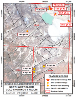 Romios’ VP of Exploration, Mr. John Biczok, P. Geo, commented, “Romios’ brief 2022 exploration program on the North West claims resulted in not only the highest-grade gold assays ever found on the property but also the identification of a set of probable control structures up to 1 km long that now provide an exciting focus for our future exploration work.”