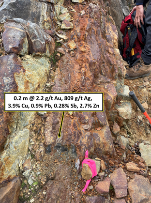 - A series of narrow, high-grade Cu-Au-Ag-Pb-Zn-Sb sulphide horizons up to 1 m wide are found within the andesite / basalt units. The cores of these zones have returned assays from trace to highs of 2.2 g/t Au, 809 g/t Ag, 3.9% Cu, 2.7% Zn, 0.9% Pb, 539 ppm As, and 0.28% Sb (antimony) over widths of 15 to 25 cm (see Photo 1 and Map 1).