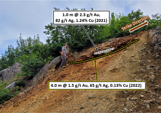 - Thick units of gossanous felsic volcanics occur in a belt NW of the mafic volcanics and the widest of these returned assays of 1.5 g/t Au, 65 g/t Ag, 480 ppm As and 0.13% Cu over 4.0 m (Photo 2). A 1.0 m wide sample collected from the centre of this aforementioned zone in 2021 assayed 2.3 g/t Au, 82 g/t Ag, 556 ppm As and 1.24% Cu with no visible copper mineralization. This zone is highly weathered at surface and the grades may well be higher in fresher rock at depth.
