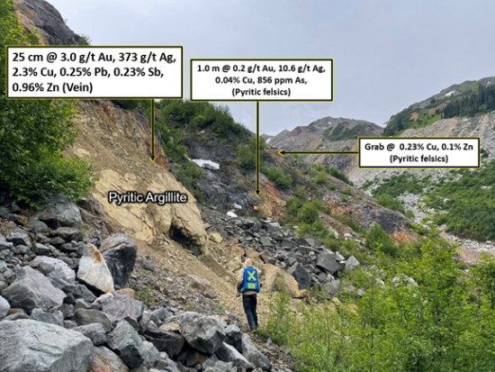 - A highly mineralized quartz vein near the felsic volcanics assayed 3.0 g/t Au, 373 g/t Ag, 2.3% Cu, 0.25% Pb, 0.23% Sb, 0.96% Zn across 0.25 m. Scattered veins of coarse-grained massive pyrite are also mineralized; one 0.1 m vein assayed 0.85% Cu, 0.27 g/t Au and 17 g/t Ag.