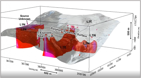 - A new 3D inversion model of a past aeromagnetic survey has identified a suspected buried pluton underlying the IP anomaly and this is now thought to be the likely source pluton of the porphyry Cu-Au system.