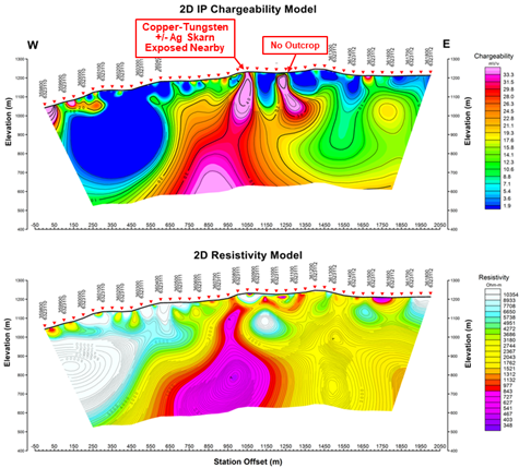 The skarns and the coincident IP anomaly strike toward both a newly mapped granodiorite pluton >600 m wide and a suspected buried pluton, ~1.1 km x 0.8 km, indicated by a recently completed inversion model of an aeromagnetic high (Map 1).