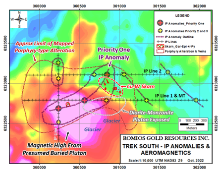 Toronto, Ontario – November 9, 2022: Romios Gold Resources Inc. (“Romios Gold” or the “Company”) (TSX.V: RG; OTCQB: RMIOF; Frankfurt: D4R) is pleased to report that its 2022 IP (Induced Polarization) survey at Trek South has detected a strong IP chargeability high interpreted to be >800 m long and up to 500 m wide that extends beyond 600 m depth beneath both a large, newly discovered, copper and tungsten bearing skarn, and the ~1 km wide porphyry-style alteration and mineralization zone discovered in 2021.