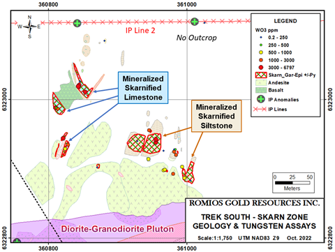 Romios’ VP of Exploration, Mr. John Biczok, P. Geo, commented, “The 2022 Trek South summer program was very successful in defining a major geophysical (IP-MT) target underlying the centre of the >1 km wide porphyry-style Cu-Au zone that Romios discovered in 2021. This area has never been drill-tested. The discovery of a copper-tungsten mineralized skarn coincident with part of this strong IP anomaly significantly increases the potential for substantial mineralization within this very well-defined drill target.”