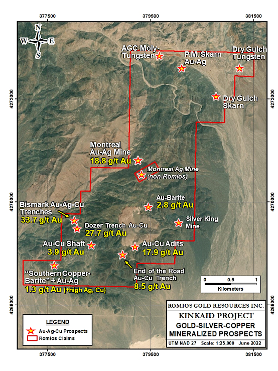 Toronto, Ontario – June 14, 2022: Romios Gold Resources Inc. (“Romios Gold” or the “Company”) (TSX.V-RG; OTCQB: RMIOF; Frankfurt: D4R) is pleased to report on high-grade gold assay results from chip and grab samples collected in April 2022 at several previously undocumented or poorly known historic gold-copper-silver prospects on the Company’s recently acquired Kinkaid project in Nevada.