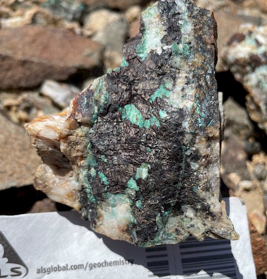 Photo #1 - Sample #E268328 from the “Au-Cu Adits” dump site. Massive, black, tarnished chalcopyrite (copper-iron sulphide) and green secondary copper mineral staining in a white quartz vein. Assayed 1.7 g/t Au. Copper and silver results pending. One of very many such pieces at this site, some assaying up to 17.9 g/t Au.