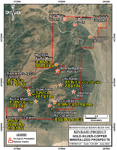 Toronto, Ontario – June 29, 2022: Romios Gold Resources Inc. (“Romios Gold” or the “Company”) (TSX.V-RG; OTCQB: RMIOF; Frankfurt: D4R) is pleased to report on the receipt of high-grade copper and silver assays to go with the previously reported high gold values (See June 14th, 2022 News Release) from chip and grab samples collected in April 2022 at several largely undocumented or poorly known historic gold-copper-silver prospects on the Company’s recently acquired Kinkaid project in Nevada.