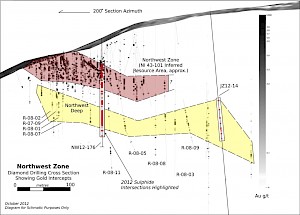 An Earthprobe resistivity survey carried out during the summer of 2012 discovered a new, highly prospective exploration target along strike of the Northwest Zone. The survey identified a highly conductive anomaly with a vertical dimension of 100 metres and a width of 100 metres recorded at a depth of 350 metres. Two historic drill holes intersected significant gold mineralization within 75 metres east of the new target at depth. Highlights from these two holes include an intersection of 185 g/t Au, 3.28% Cu, and 108 g/t Ag over 0.33 metres (1.08 feet) in drill hole R-08-05 (Press release dated November 26, 2008), and 15.74 g/t Au over 1.5 metres (4.92 feet) in drill hole 90-21 (Gulf International Minerals Ltd., 1990). The location of this anomaly, which coincides with known gold mineralization, indicates significant potential for a target similar to that of the Northwest Zone, or alternately, an extension of the Northwest Zone into the new target area. A complete geophysical analysis announcing the results from this summer's survey at the Northwest Zone is forthcoming.