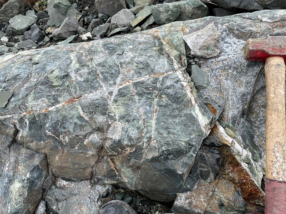 Plate 1: Example of an epidote altered, quartz-pyrite+/-chalcopyrite veinlet stockwork outcrop, TREK South claims. Small sledge hammer for scale.