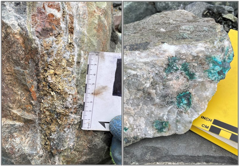 In 2021, Romios personnel undertook detailed mapping and sampling across part of the Trek South claims that until recently had been covered by relatively thin glacial ice and snowfields, resulting in the discovery of the porphyry-type mineralized and altered zone. In addition, the 2021 survey partially defined previously unknown intrusions which may be related to the mineralizing event, as well as numerous boulder trains of massive epidote alteration, +/- local copper mineralization (see Plate 3), apparently derived from an area still hidden beneath the glacier.