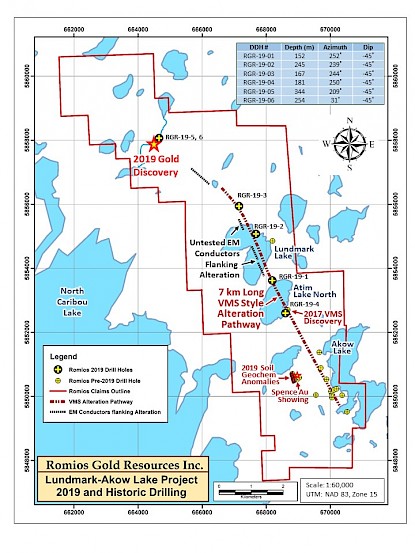 The geology and styles of mineralization encountered on the northwestern claims in holes RGR-19-5 and 6 are unique in this area. As well as the gold-bearing quartz-pyrrhotite and calcite veins, they include broad zones of chalcopyrite vein mineralization and numerous blue quartz-eye – feldspar porphyry intrusions that may be indicative of a volcanic center. This intrusive-volcanic complex lies directly along strike from the >7 km long VMS (Volcanogenic Massive Sulphide) style alteration pathway believed to be responsible for the deposition of high-grade massive sulphides 6 km to the southeast at Atim Lake North (1.9 m @ 2.35% Cu, 1.4 g/t Au and 68 g/t Ag; see Romios news release September 19, 2017). This association suggests that the northwestern claims have significant potential for not only gold-bearing quartz-pyrrhotite veins but VMS mineralization as well. In addition to the two EM conductors coincident with the gold-bearing veins, six additional VTEMTM conductors remain to be tested in the immediate vicinity of holes RGR-19-5 and RGR-19-6 while another seven substantial