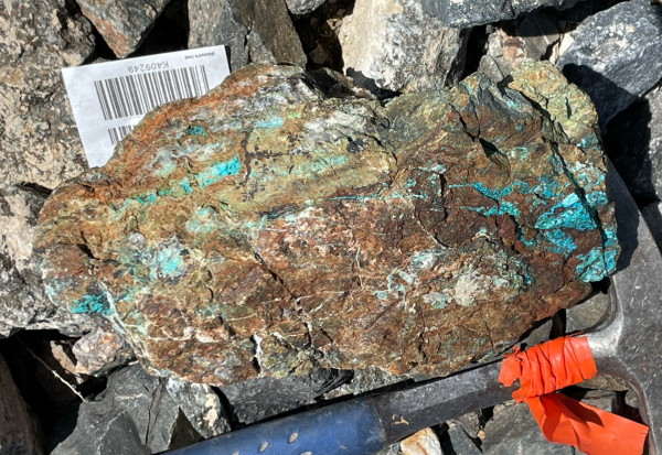 Photo 1: One of the 9 copper-rich boulders sampled on the new claims. Assayed 2.5% Cu, 2.4 g/t Au.