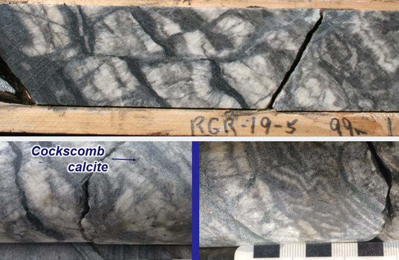 "Epithermal-looking”, locally gold-bearing coarse calcite vein, DDH RG-19-05