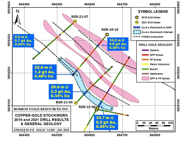 First discovered in 2019 while drill testing a number of EM conductors nearby, these broad zones of gold-bearing chalcopyrite veinlets themselves do not produce a strong VTEM response. Stockworks are developed in relatively unaltered basalt adjacent to several QFP and FP intrusions. Individual or local clusters of veinlets can be very high-grade, up to 3.5% Cu, and gold assays from 3 g/t Au to 8 g/t Au are not uncommon. Tungsten values up to 0.6% W suggest that the ore fluids came at least in part from the QFP-FP dykes. The 3 widest and most consistent stockwork intercepts occur along the southern edge of the same QFP dyke and were intersected in holes RGR-19-06, 19-10 and 21-04 over a strike length of about 125 m (see map below).