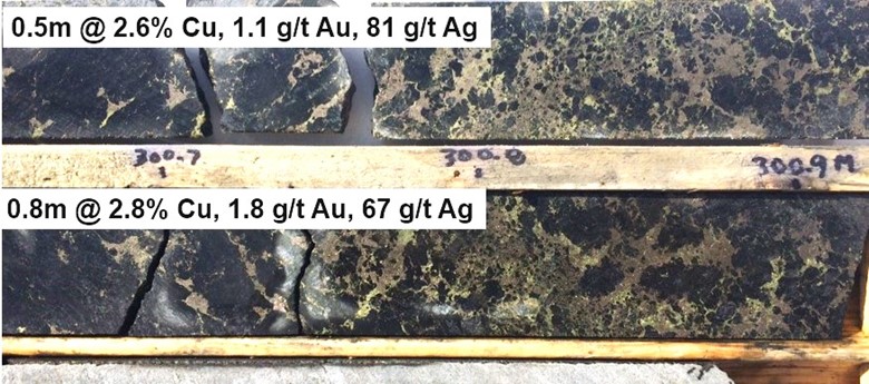 DDH RGR-19-10: Close-up photograph of the Southern VMS Zone - 3.5 m @ 1.26% Cu, 2.4 g/t Au, 23 g/t Ag, Incl. 1.7 m @ 2.24% Cu, 4.3 g/t Au, 0.6% Zn, 44 g/t Ag.