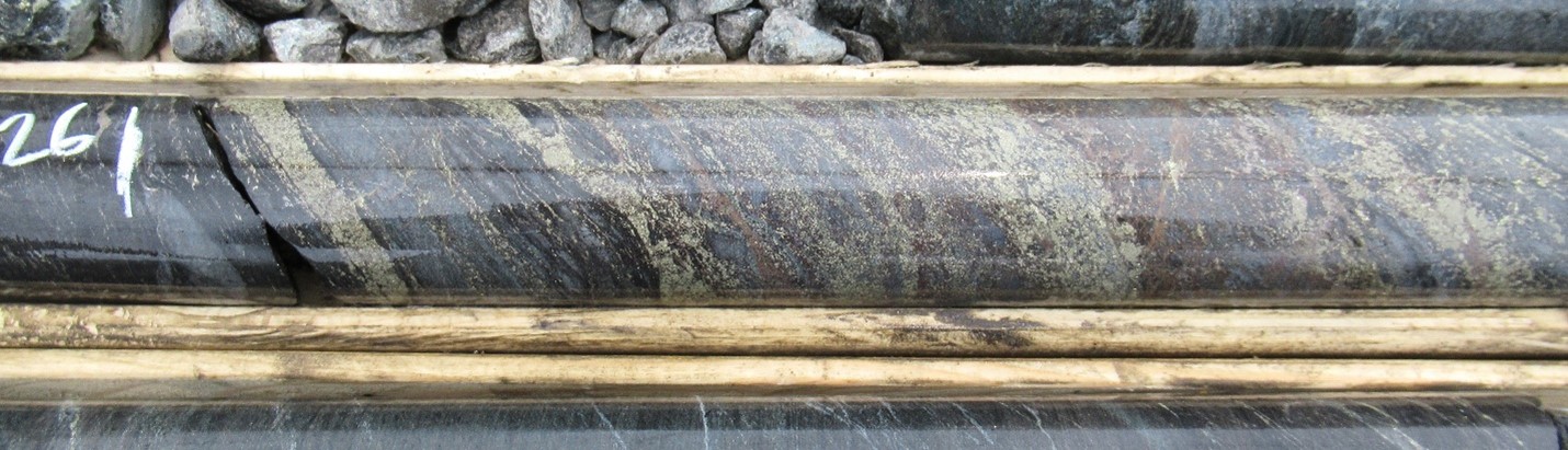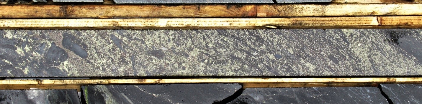 DDH RG-19-10: sphalerite-pyrite rich portion of one sulphide zone which assayed 2.6 m @ 0.43% Cu, 1.5 g/t Au, 34 g/t Ag, 1.84% Zn, 0.73% Pb.