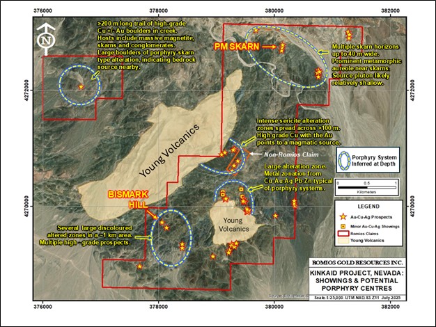 Toronto, Ontario – October 21st, 2025: Romios Gold Resources Inc. (“Romios Gold” or the “Company”) (TSXV: RG) (OTCID: RMIOF) (Frankfurt: D4R) is pleased to announce that is has begun a 10-day field program of detailed geological mapping and sampling to follow up significant gold assays returned earlier this year from newly discovered epithermal gold-silver zones at the PM Skarn and Bismark Hill sites on the Company’s 100% owned, road-accessible Kinkaid project in the Walker Lane trend of western Nevada (see news, August 7, 2025). The PM Skarn and Bismark Hill targets, along with dozens of old mine workings and prospect pits dispersed across the wider Kinkaid property, appear to be part of much larger alteration and mineralization systems postulated to overlie as many as five buried porphyry Cu-Au intrusive centres (see Figure 1). The goal of the current program of mapping, rock chip and soil sampling, together with an induced polarization (IP) survey anticipated for 2026, is to advance the PM Skarn and Bismark Hill targets toward drill-ready status.